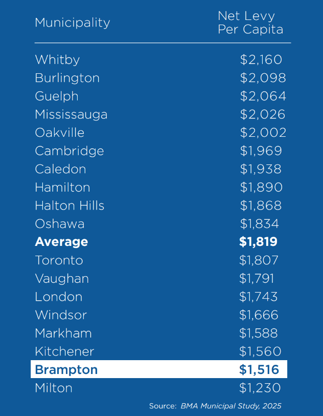 ​                        Brampton continues to maintain one of the lowest property tax rates in the GTA (Source: BMA Municipal Study, 2025).