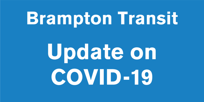 The City of Brampton is working closely with its partners at Peel Public Health and the Brampton Emergency Measures Office to continue to monitor risks. Visit www.brampton.ca/covid19 for regular updates and visit www.bramptontransit.com or follow @bramptontransit on Twitter for service updates.