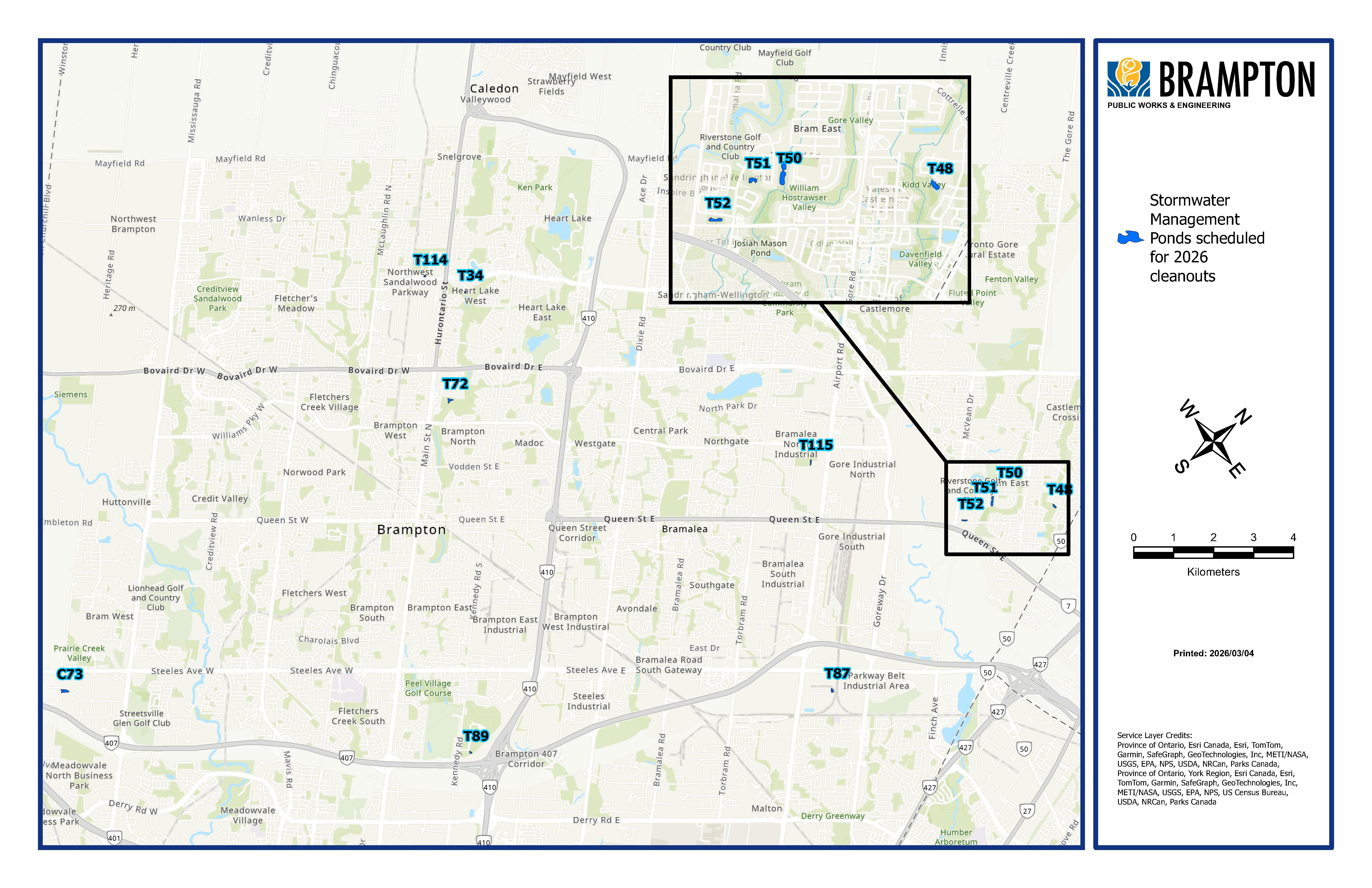 The City of Brampton inspects and maintains over 180 stormwater ponds across the city. These ponds play a critical role in managing runoff, reducing flooding and erosion,improving water quality, and protecting local ecosystems. As runoff flows over hard surfaces like roads, driveways, and parking lots, it collects pollutants such as dirt and oil. Stormwater ponds act as a buffer, allowing sediment to settle before cleaner water flows into local rivers and creeks.